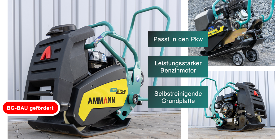 Die BG BAU fördert Investitionen in moderne Verdichtungsmaschinen, weil sie den Arbeits- und Gesundheitsschutz auf Baustellen verbessern. Davon profitieren auch unsere aktuellen Ammann-Modelle wie die APF 12/40-2 und APF 12/50-2 Rüttelplatten. Die BG BAU übernimmt dabei bis zu 50 % der Anschaffungskosten, maximal 800 € pro Gerät (je nach Ausführung und Förderkatalog).